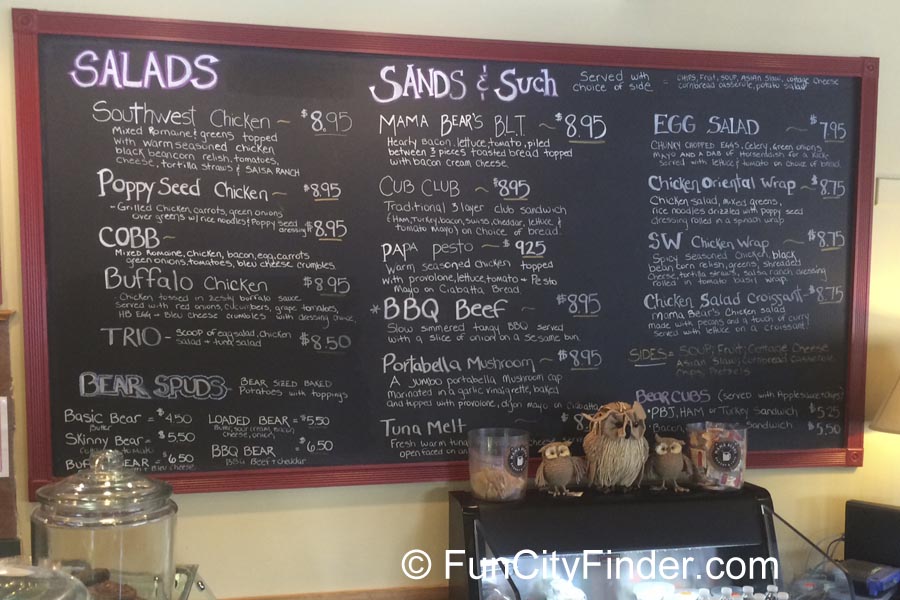 My husband and I just stumbled onto Mama Bear’s, looking for a place to get a bite to eat and kill some time before our son’s elementary school football game. The staff greeted us with a smile, impressive considering they were about to close in 45 minutes. The decor definitely gives evokes a cozy mountain lodge feel. Hubbard & Craven’s coffee is in the coffee pot, but I’m not a coffee drinker. What I was on that Sunday afternoon was hungry, so I was glad to see the broad menu carefully written on a giant blackboard.