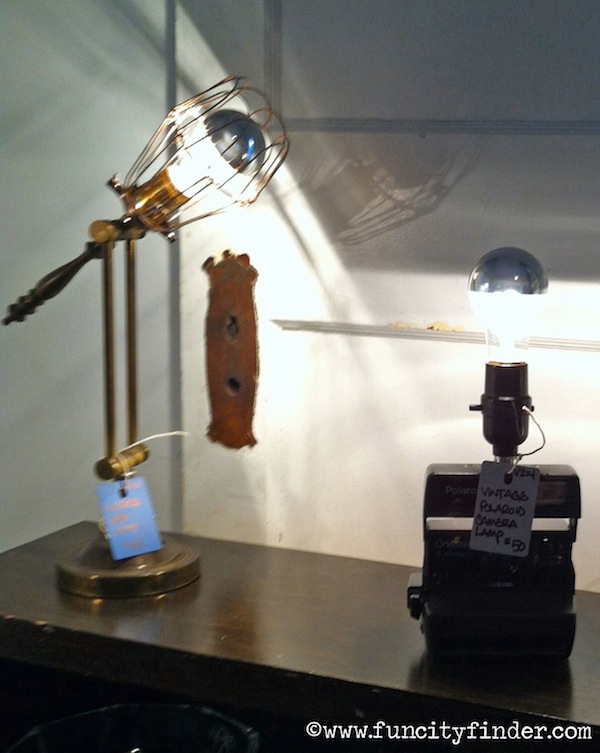 Rust & Roses: Rust & Roses, newly opened in December 2013, is removed from the rest of this line of stores by one street and about a minute-long walk. The store had some great old stuff from the 1930s and 1940s, including chicken-stamped spice racks and bright, big costume jewelry. The thing that caught my eye in this burnt orange store were lamps made of items like old cameras, video recorders, and film slides.