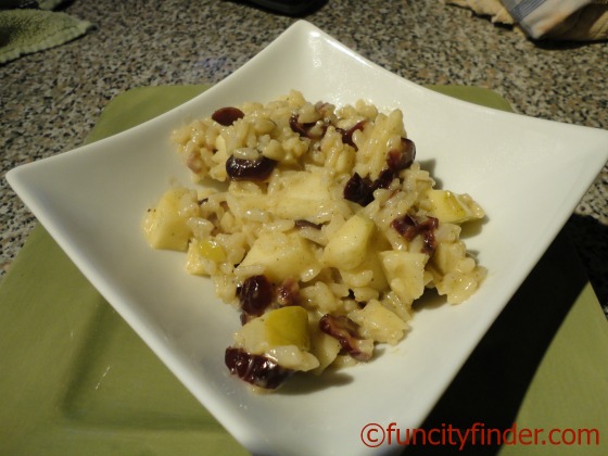 One such fall meal using my favorite local apples is Gorgonzola, apple and cranberry risotto. Don’t be afraid to try risotto, it is not as hard as you think. Get all of your ingredients ready beforehand and the process goes much more smoothly. This is a great one-dish meal and also compliments bake chicken, fish or pork.